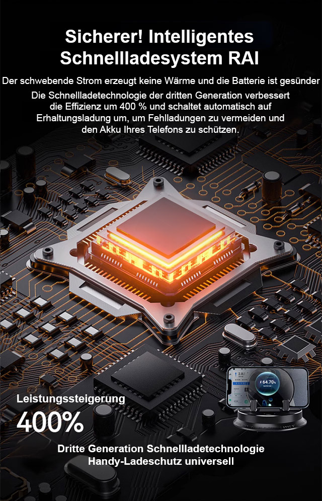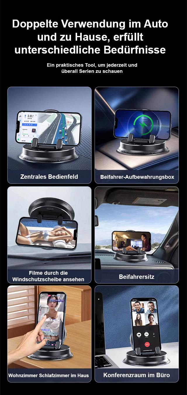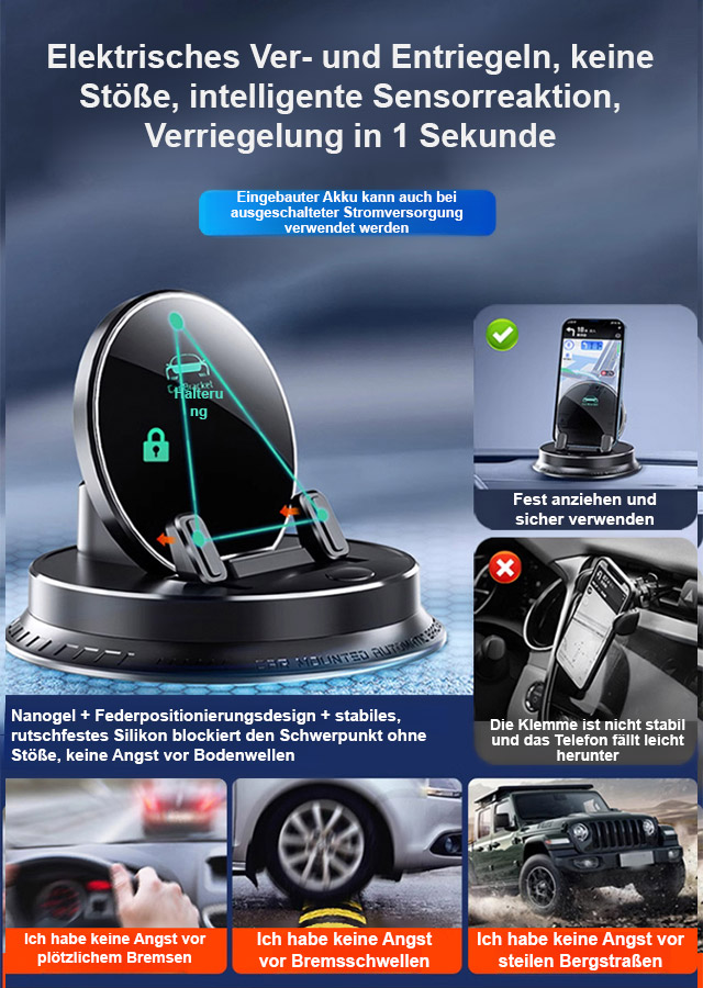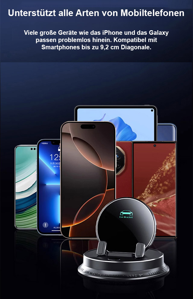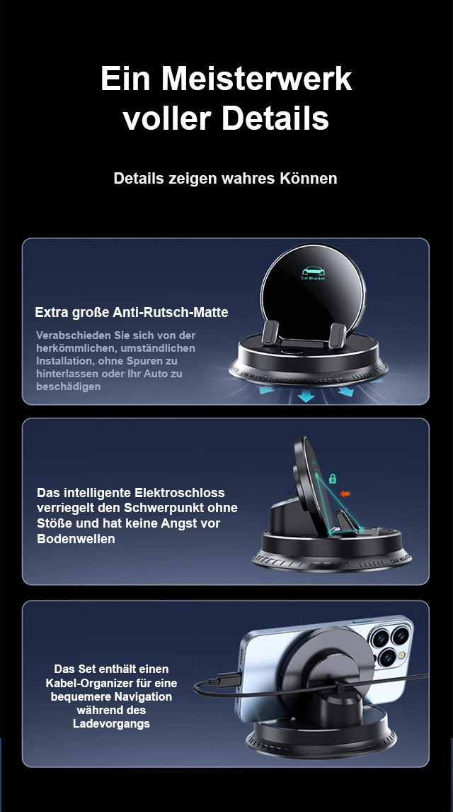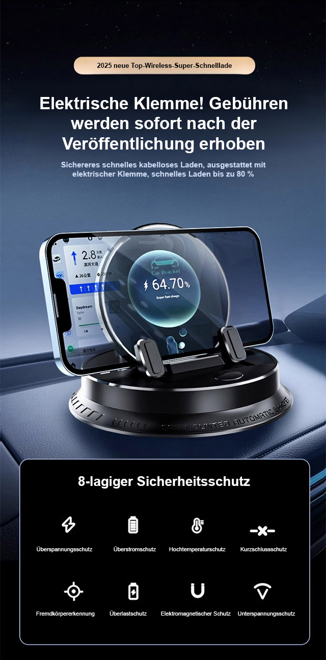 ⚡Superschnelles kabelloses Laden – bis zu 400% effizienter. 🔥360° freie Drehung. Automatische Klemmtechnik – einfach ablegen, sicher fixiert. 🎯Universelle Haftung auf jeder Oberfläche – ohne Kleber, ohne Rückstände. ✅Kompatibel mit allen Smartphones & Fahrzeugen.